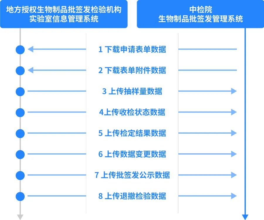 系統(tǒng)支持與中檢院生物制品批簽發(fā)管理系統(tǒng)的直接對接,實現(xiàn)疫苗批簽發(fā)申請表單數(shù)據(jù)及附件信息的自動獲取,實現(xiàn)抽樣量數(shù)據(jù)、收檢狀態(tài)數(shù)據(jù)、檢定結(jié)果數(shù)據(jù)、數(shù)據(jù)變更數(shù)據(jù)、批簽發(fā)公示數(shù)據(jù)、退撤檢數(shù)據(jù)的自動上傳,大幅度減少實驗室業(yè)務(wù)受理人員、數(shù)據(jù)上報人員對相同信息在不同系統(tǒng)中重復(fù)錄入的工作量,確保信息的完整性和一致性,提升批簽發(fā)工作效率,提升批簽發(fā)信息上報及時性。