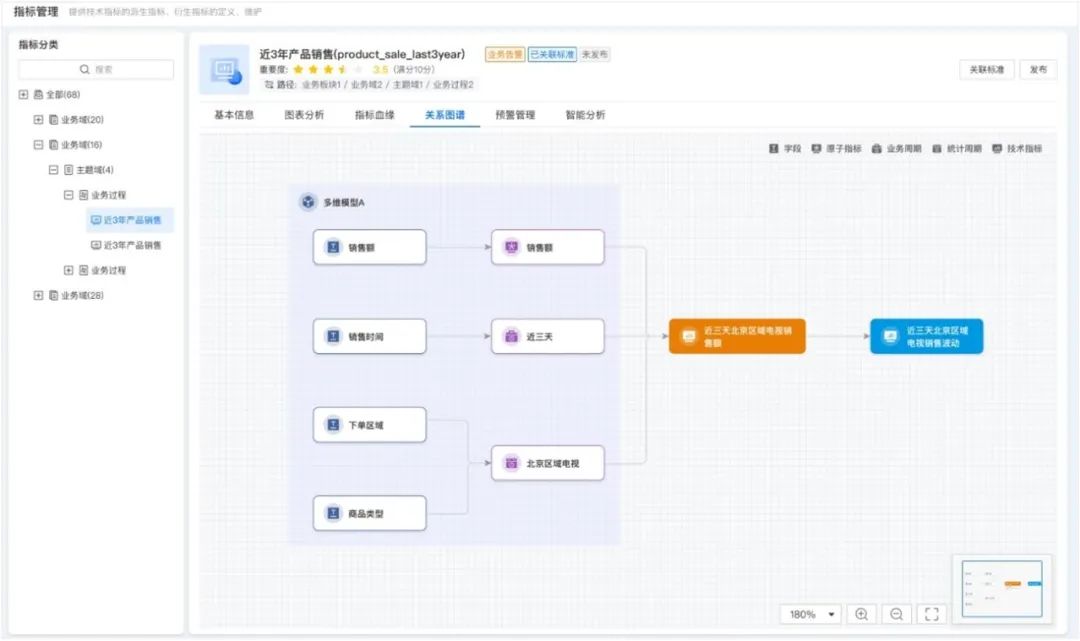 平臺將指標拆分成更細粒度的原子指標、統計周期、業務限定去管理,提高指標的開發速度,提升指標的復用性、統一指標的業務和技術口徑。如果指標異常,還能實現指標溯源,同時提供了從指標標準到定義到管理的完整能力。