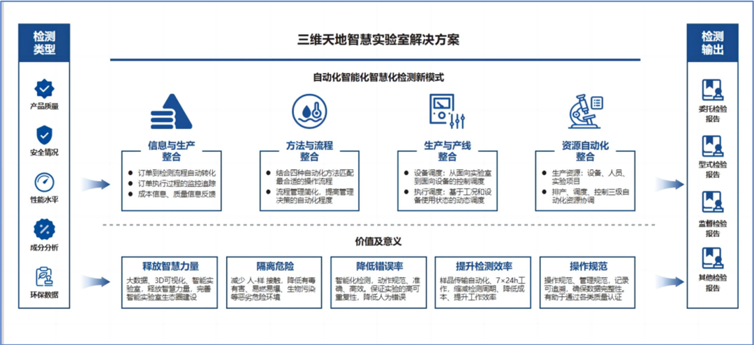隨著物聯網等高新技術的發展,面對上述種種困境,實現對分析測試實驗室的智慧化管理是一種必然趨勢。三維天地針對性地打造了一套智慧實驗室綜合管理解決方案,如同為實驗室裝上了一顆“智能大腦”,通過應用各類數字化技術與智能化設備和應用系統進行有機融合,并通過實驗過程自動化執行平臺的構建,可深度整合各業務模塊,協調使用各項資源,形成一個高效的管控整體,從而顯著提升實驗室的綜合運營與協作效率,優化實驗室資源管理與安全管理。