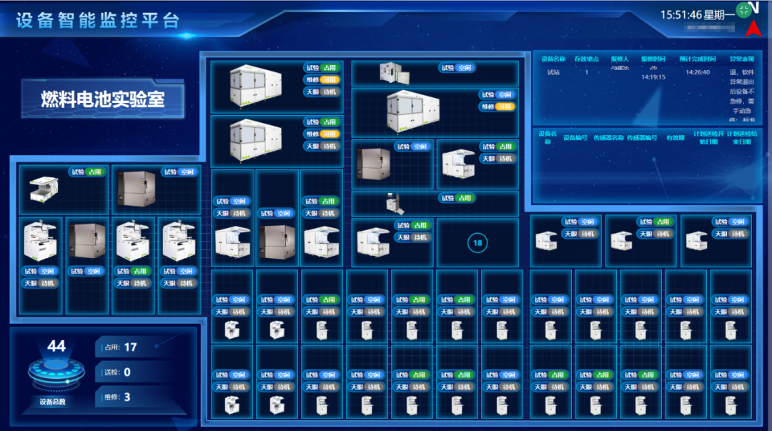 同時,本期項目根據(jù)實驗室設(shè)備的使用情況與狀態(tài),設(shè)計了設(shè)備智能監(jiān)控的可視化駕駛艙展示,按照實驗室現(xiàn)場的實際布局俯瞰圖,動態(tài)監(jiān)視試驗主設(shè)備的當(dāng)前運(yùn)行狀態(tài),幫助實驗室管理人員實時監(jiān)測實驗室設(shè)備的運(yùn)行與使用情況,提高了實驗室的資源利用效率。