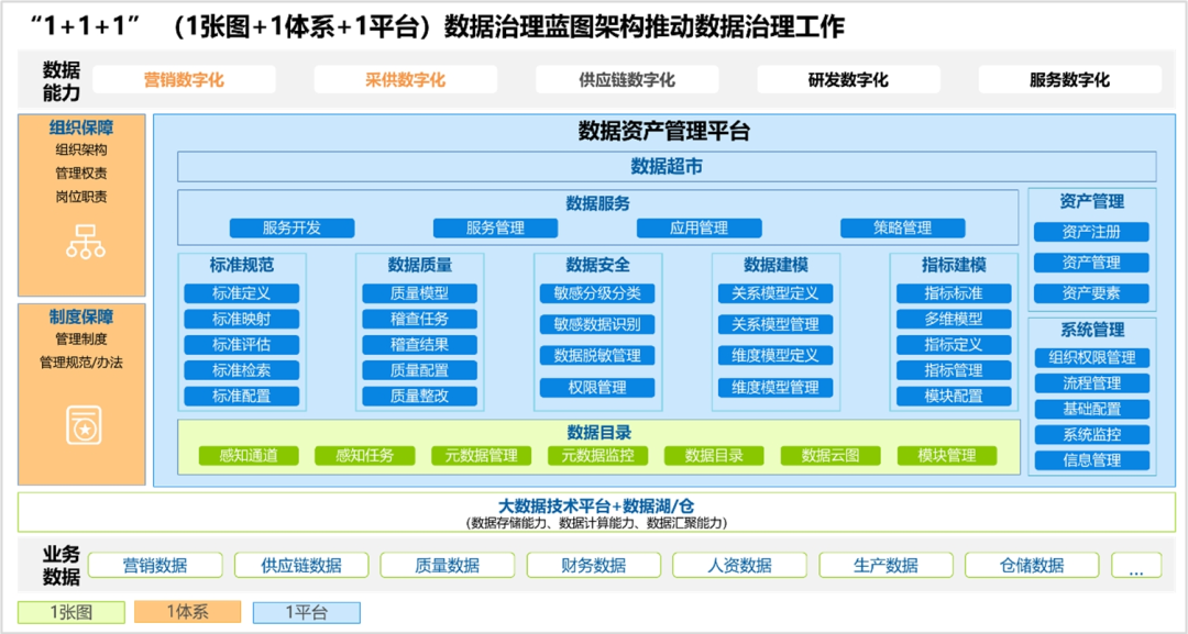 項目圍繞“1+1+1”的數據治理架構,提高數據質量,實現廣泛的數據共享,發揮數據價值。通過對某重卡企業的數據資源進行盤點,構建了以數據架構為核心,涵蓋了資產目錄、數據分布情況、數據標準以及企業級數據模型的數據治理“1”張圖。基于數據治理能力要求,形成以組織保障、規章制度、管理流程為核心的貫穿數據全生命周期的數據治理“1”個體系。通過數據資產管理平臺與企業大數據平臺的拉通,打造數字化轉型的核心引擎“1”個平臺,增強了企業數據底座能力,實現數據開發治理一體化。
