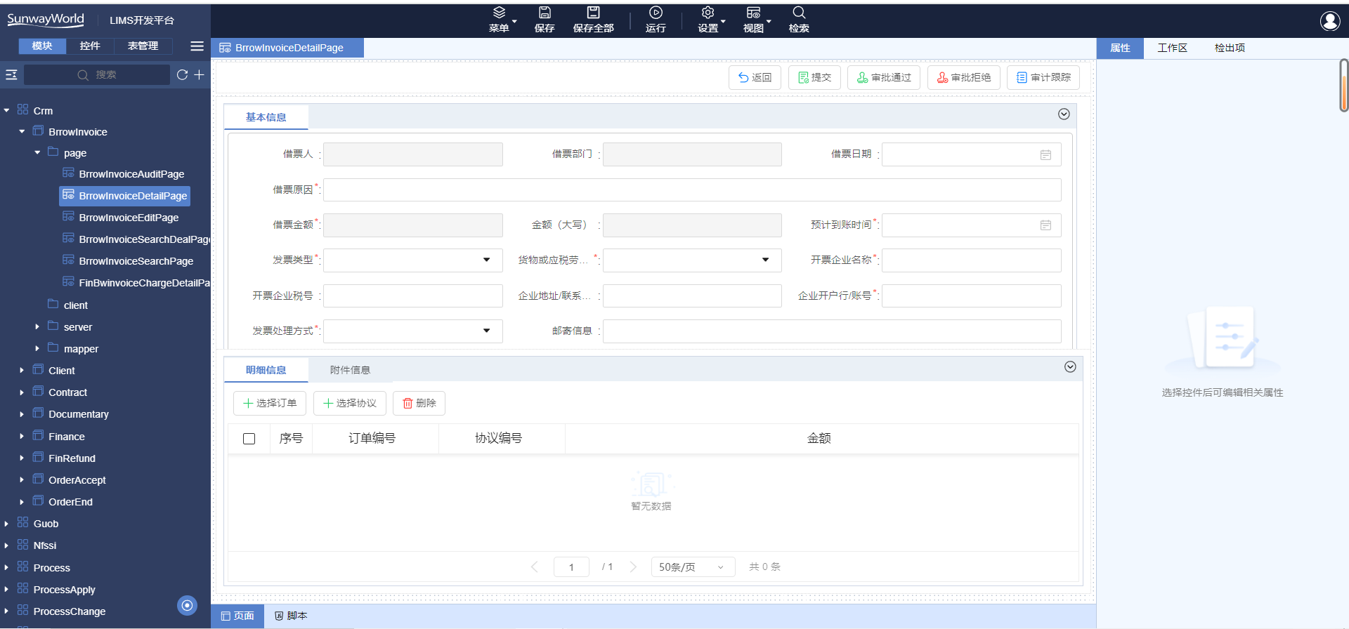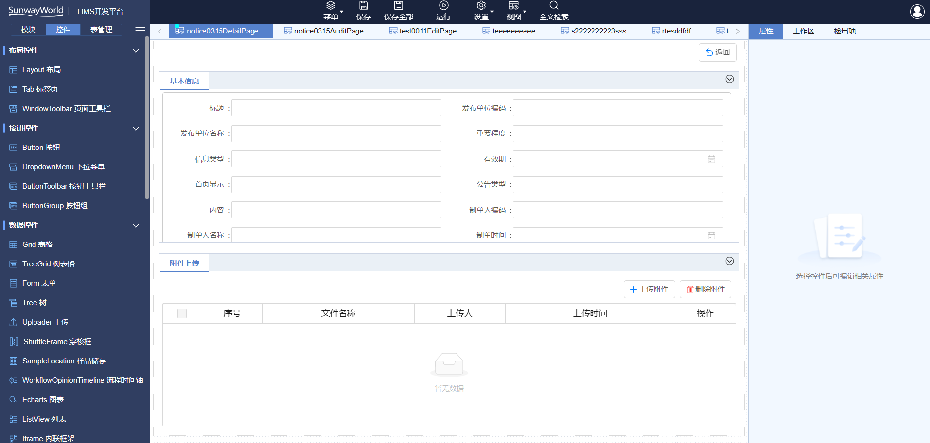 平臺內置LIMS產品的所有界面控件,分為布局控件、按鈕控件、數據控件、輸入控件、導航控件等,通過拖拽方式即可繪制出界面,方便項目實施,客戶后續可自行維護,方便快捷。