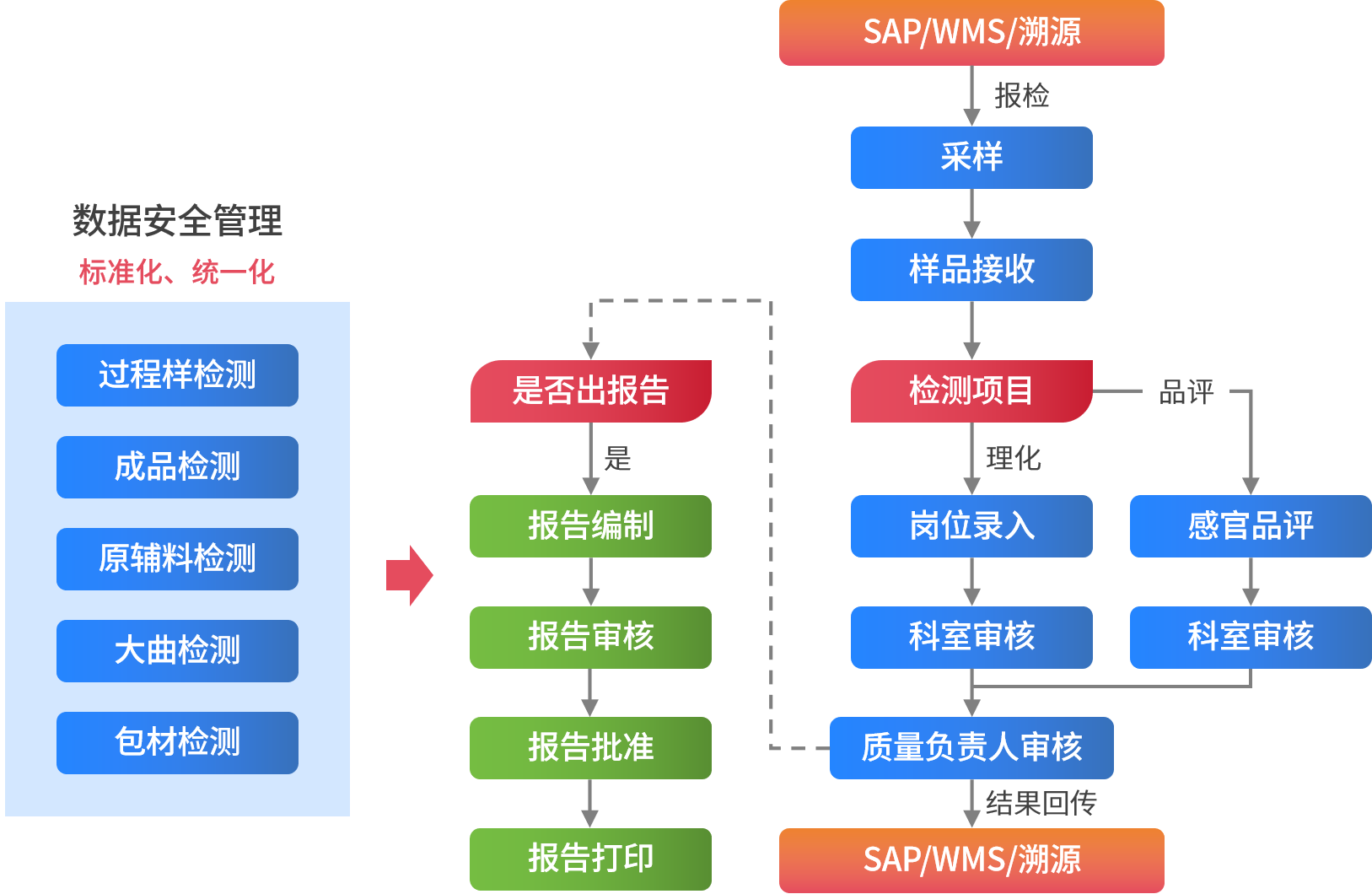 通過(guò)融合先進(jìn)的數(shù)字化實(shí)驗(yàn)室管理理念、規(guī)范和方法,SW-LIMS結(jié)合白酒行業(yè)企業(yè)的實(shí)際業(yè)務(wù)管理需要,對(duì)檢驗(yàn)業(yè)務(wù)流程進(jìn)行優(yōu)化,對(duì)現(xiàn)有檢驗(yàn)管理方式(如線下業(yè)務(wù)轉(zhuǎn)線上業(yè)務(wù),紙質(zhì)單據(jù)轉(zhuǎn)電子單據(jù)等)進(jìn)行改革,打通上下游系統(tǒng),實(shí)現(xiàn)報(bào)檢下樣、結(jié)果報(bào)出與企業(yè)現(xiàn)有系統(tǒng)自動(dòng)對(duì)接(如SAP、WMS、SRM,溯源等企業(yè)已有系統(tǒng)),使得業(yè)務(wù)流程設(shè)定更加靈活、規(guī)范、高效,更貼近實(shí)際業(yè)務(wù),實(shí)現(xiàn)對(duì)業(yè)務(wù)工作的可知、可控、可預(yù)測(cè)管理,實(shí)現(xiàn)對(duì)實(shí)驗(yàn)室資源的信息化管理,實(shí)現(xiàn)實(shí)驗(yàn)室業(yè)務(wù)的規(guī)范化、自動(dòng)化、數(shù)字化管理,且系統(tǒng)中各業(yè)務(wù)均支持自定義、可視化配置,進(jìn)一步提升了各檢驗(yàn)機(jī)構(gòu)的業(yè)務(wù)管理水平。