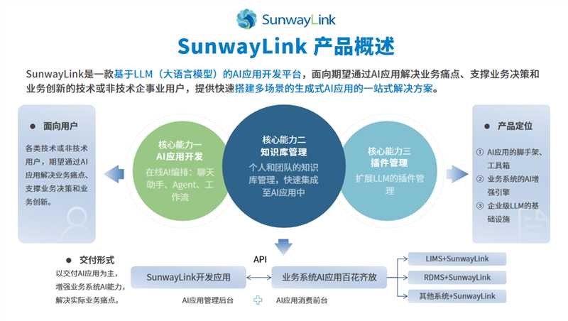 SunwayLink是一款基于LLM(大語言模型)的AI應用開發平臺,面向期望通過AI應用解決業務痛點、支撐業務決策和業務創新的技術或非技術企事業用戶,提供快速搭建多場景的生成式AI應用的一站式解決方案。可以提供聊天助手、智能體、工作流三種應用開發能力,開發好的應用可快速封裝為API,可由后端或前端應用直接調用,提供基于RAG(檢索增強生成)技術的可視化知識庫構建能力,快速接入結構化和非機構化數據構建個人和企業知識庫。