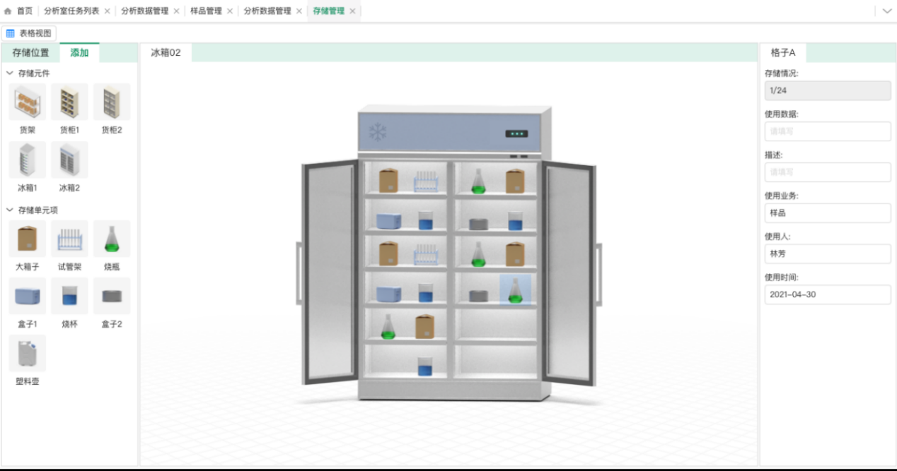 - 試劑耗材可視化管理,庫(kù)存盡在掌控:建立3D試劑耗材庫(kù)存管理模型,實(shí)現(xiàn)對(duì)標(biāo)準(zhǔn)試劑、消耗品的精準(zhǔn)庫(kù)位追蹤。集成庫(kù)位環(huán)境監(jiān)測(cè)信息,實(shí)驗(yàn)室管理人員可實(shí)時(shí)、可視化監(jiān)控試劑耗材存儲(chǔ)狀態(tài)與安全環(huán)境,確保物資存儲(chǔ)規(guī)范、使用可溯。