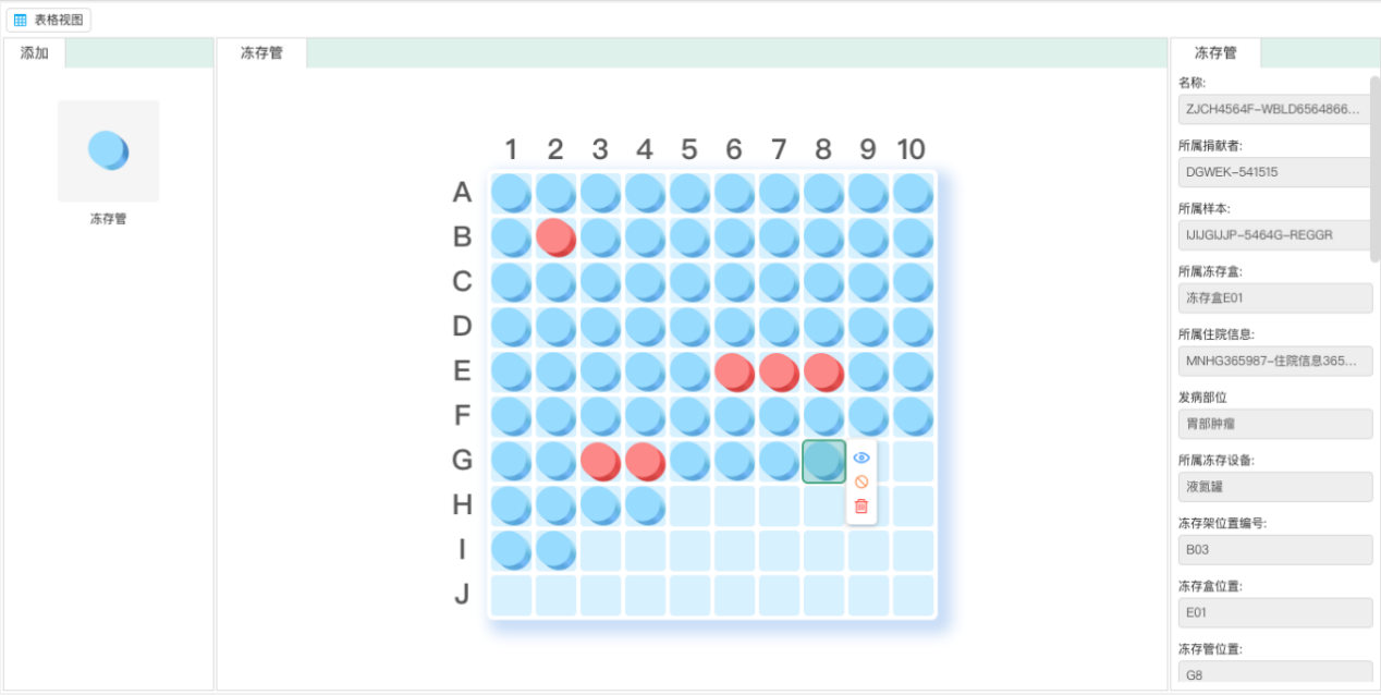 - 生物樣本全程可視,溯源精準(zhǔn)高效:對(duì)生物樣本存儲(chǔ)柜規(guī)格、布板進(jìn)行可視化建模,樣本存儲(chǔ)分布按實(shí)物布局實(shí)現(xiàn)可視化監(jiān)控與精準(zhǔn)追蹤。系統(tǒng)確保每一份樣本信息可快速定位、狀態(tài)清晰可見(jiàn),為樣本安全和高效利用提供強(qiáng)力保障。