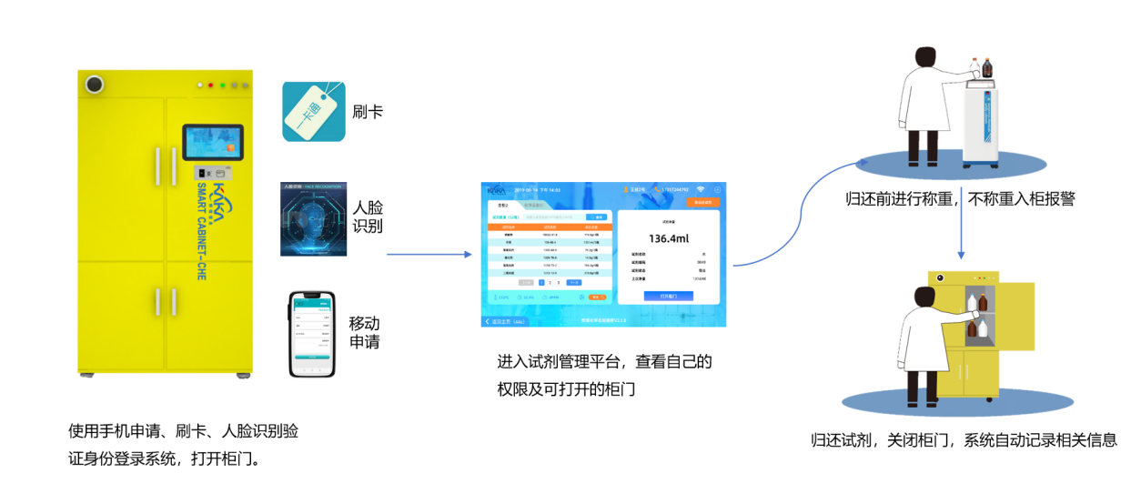 - 危化品智能管控,安全精準(zhǔn)無(wú)憂:創(chuàng)新集成智能試劑柜、RFID標(biāo)簽及人臉識(shí)別技術(shù),構(gòu)建?;罚ㄈ缫字贫?、易爆品)智能安全管理閉環(huán)。系統(tǒng)自動(dòng)校驗(yàn)實(shí)驗(yàn)人員試劑領(lǐng)取權(quán)限,實(shí)時(shí)智能核減庫(kù)存量,并實(shí)現(xiàn)耗材快速定位與自動(dòng)化盤(pán)點(diǎn),安全與效率雙提升。
